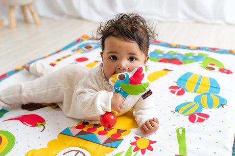 The Fiesta Playmat to Bag is the perfect playmat for on-the-go fun and tummy-time, including all kinds of stimulation with a rattle, teether, and mirror – plus room on the pad for socializing with a friend. Perfect for an impromptu picnic on the grass!  The playmat is machine washable and features three playful ‘peek-a-boo’ crinkly flags that stimulate the baby's sense of touch. It's great for indoor and outdoor activities!