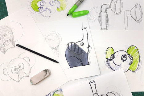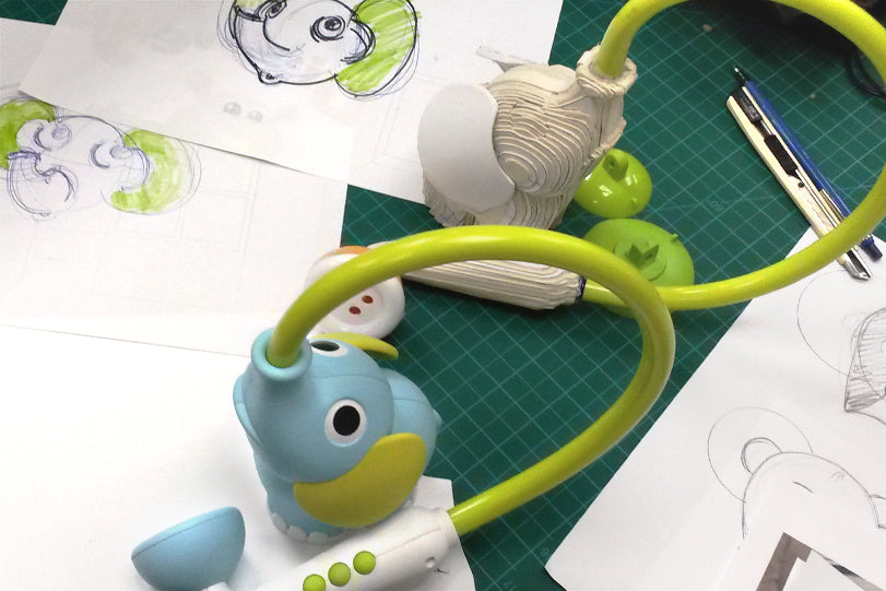 In the kick-off phase, we examine a wide range of options, and we sit down to discuss sketches and plan prototypes for various alternatives. We argue and deliberate. We debate the whimsy and functionality. We go back and forth about the play we want to include in the toy and the developmental benefits we believe it should have. First and foremost in our minds is for your child to have fun and explore, but we do also consider the parent’s accessibility and comfort. Our elephant shower, for example, was all about helping parents give babies the gentlest bath possible. And so, we considered the ergonomic design of the handle so that it is both comfortable for the parent and can eventually be operated and aimed by the baby. Out of all the sketches, we choose the one with the most accurate structure and versatility, the one that will maximize enjoyment, and has the greatest potential to engage and develop your child. This is the sketch we pick for further development.